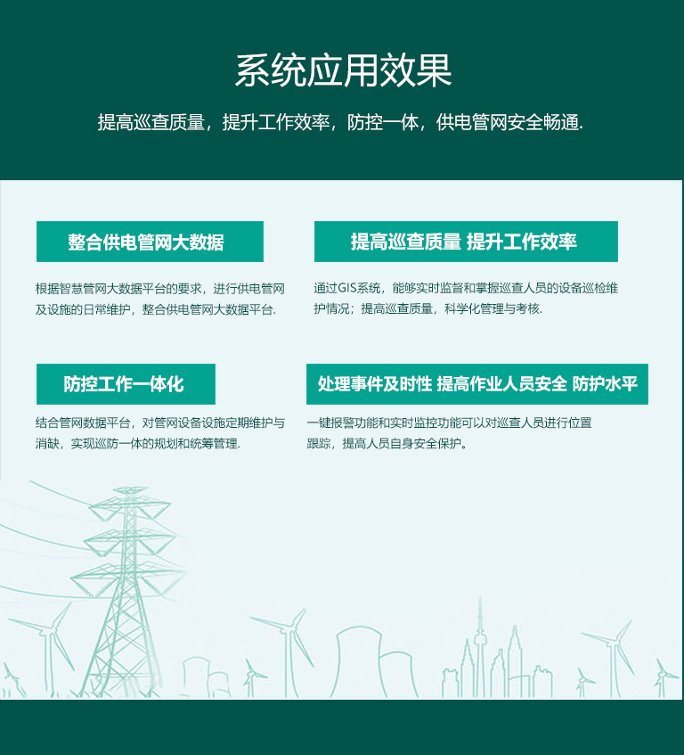 通過《智慧電網GPS巡檢管理系統》,規范巡回檢查行為,強化巡查質量,實現供電管網防控工作科學化、規范化、智慧化和大數據平臺化的推進和實施,確保供電官網安全暢通。